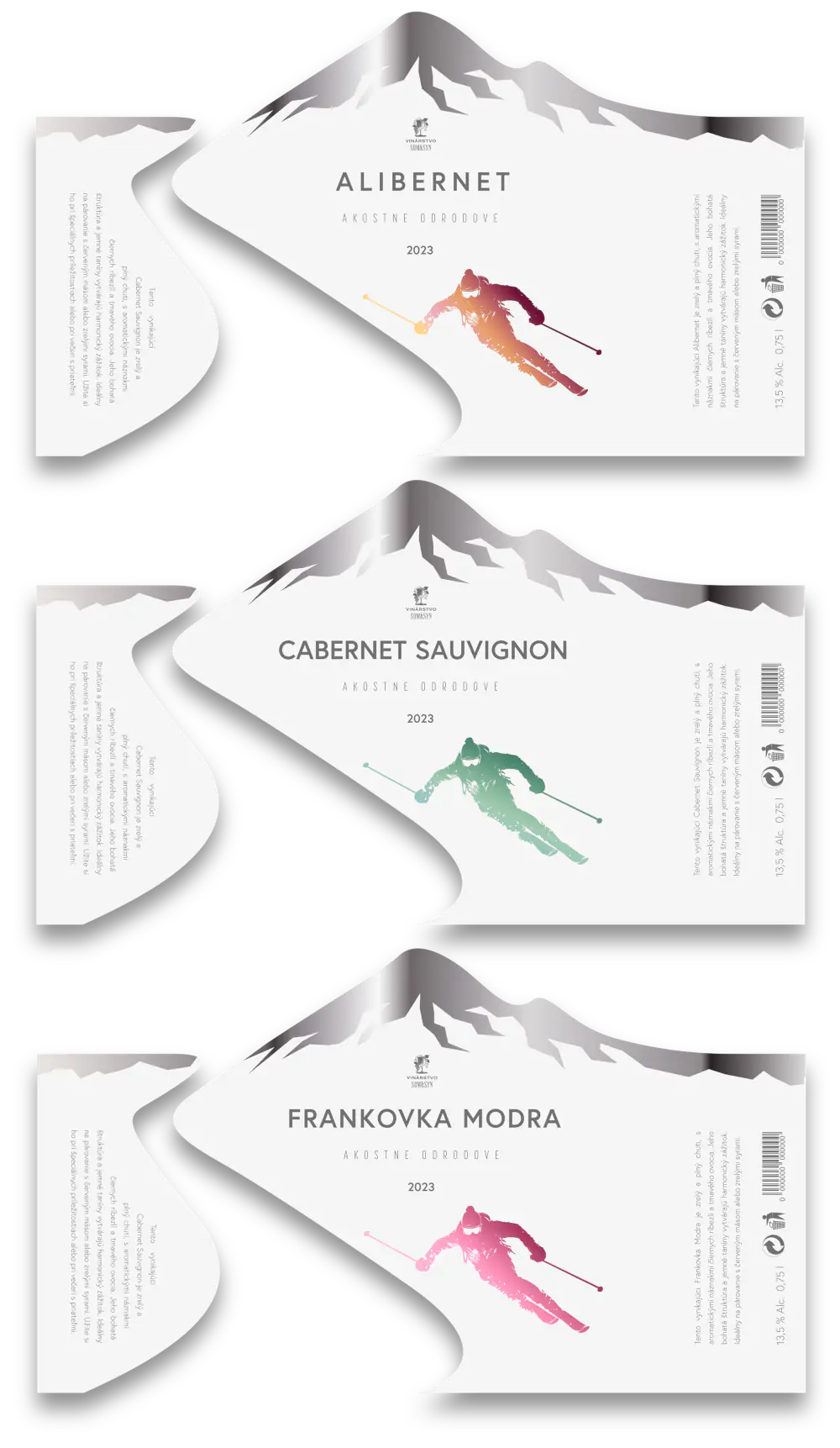 Silueta hôr je integrovaná priamo do tvaru etikety, čím vzniká silný vizuálny podpis.